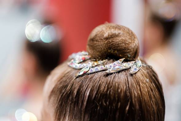 Нельзя использовать объемные заколки, банты и т.д. Хвост и коса запрещены на тренировках, так как это небезопасно для ребенка. В процессе тренировки гимнастки выполняют большое количество элементов акробатики и прыжков, неубранные волосы мешают выполнению данных движений и вызывают дискомфорт, а также травмы.